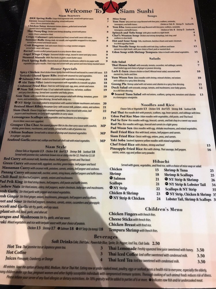 Siam Sushi offers a unique blend of Thai and Japanese cuisine with a focus on fresh, flavorful dishes. Located in Tallahassee, FL, this restaurant caters to a variety of dietary preferences with vegan and vegetarian options. The menu features sushi, Thai classics, and a children's menu for little ones. Customers rave about the inviting atmosphere, attentive staff, and delicious food. Standout dishes include rice noodles with shiitake mushrooms, duck rolls, and the sushi boat. Siam Sushi prides itself on accommodating special requests and providing top-notch service. With a range of beverage options and a full bar, this restaurant offers a complete dining experience. Whether you're looking for a casual meal or a special night out, Siam Sushi promises a memorable culinary journey.